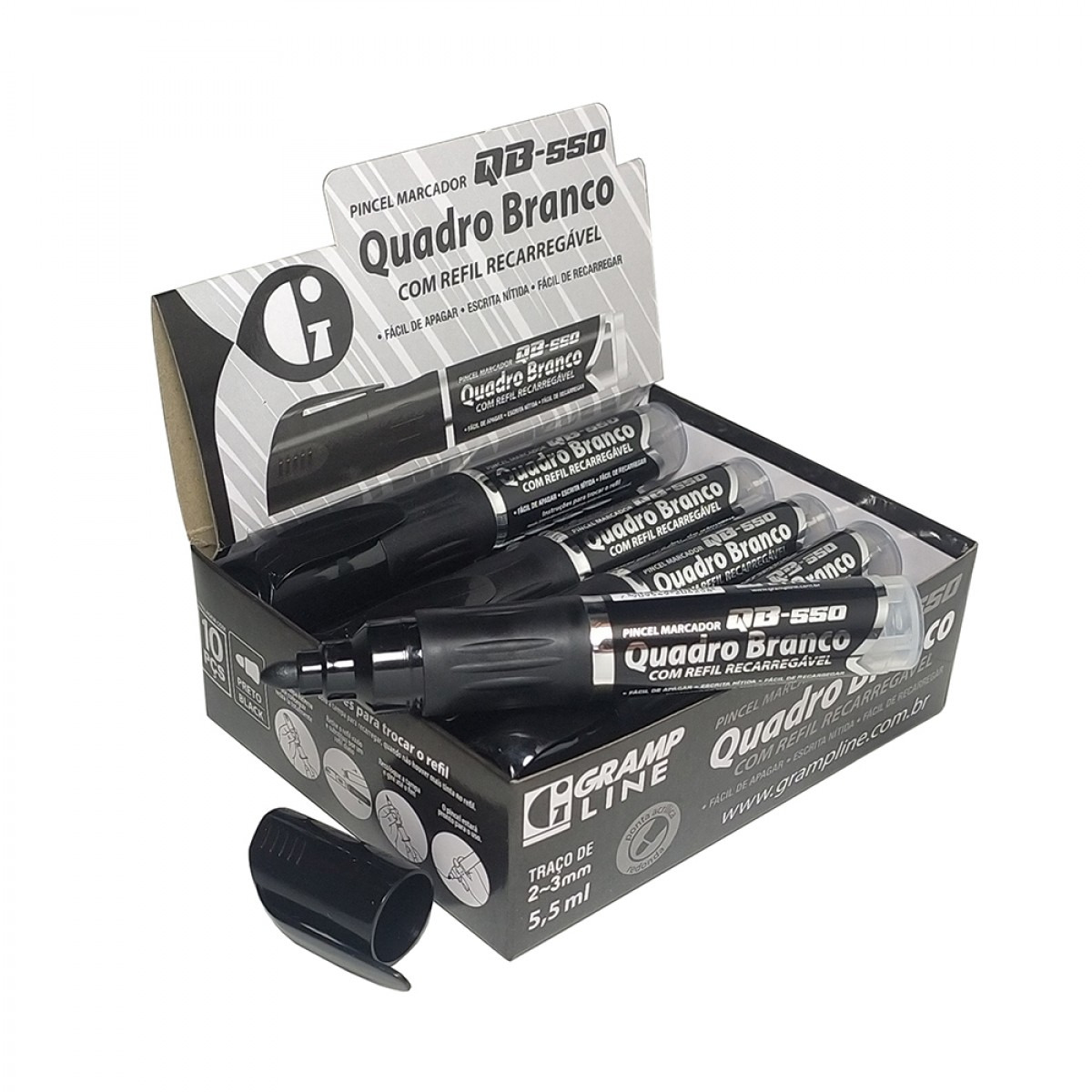 CAIXA DE MARCADOR DE QUADRO BRANCO RECARREGAVEL QB-550 PRETO C/10 GRAMPLINE
