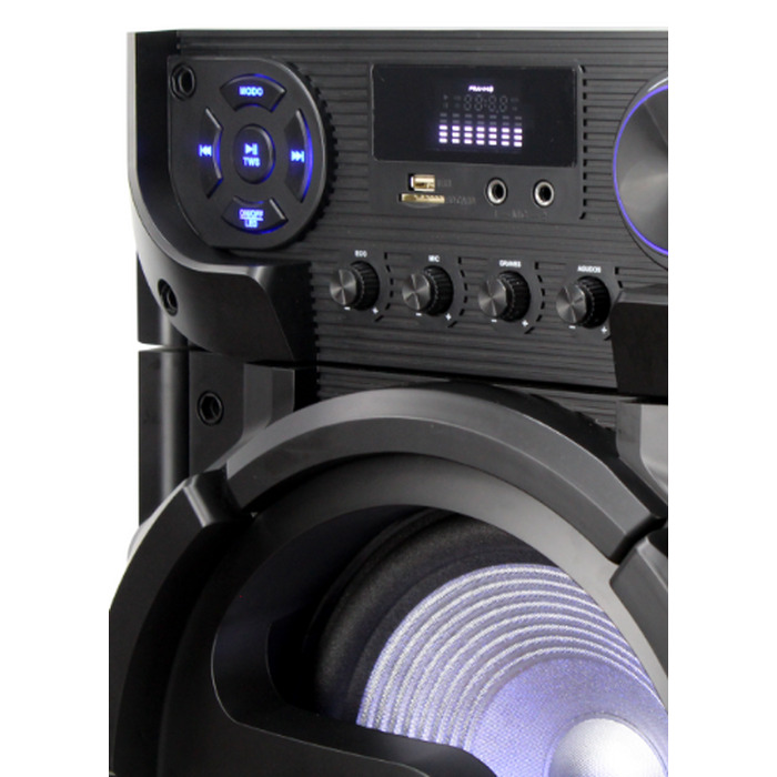 Entradas: Bluetooth, USB, Micro SD, Auxiliar (RCA) estéreo, 2x (P10) mono , microfone, violão