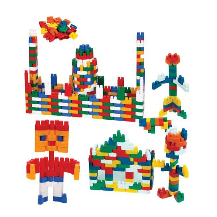 Conteúdo: 500 peças em cores vivas, incluindo formatos para 12, 8, 4 e 2 encaixes, telhados, bonecos e eixos com rodas.