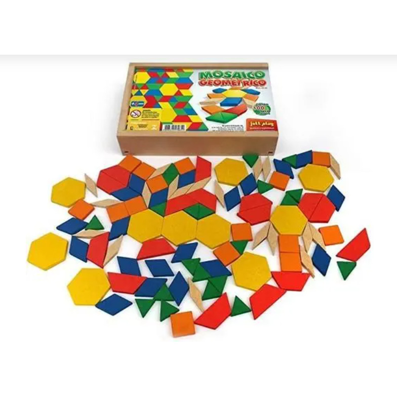 DETALHES ADICIONAIS: confeccionado em madeira, contendo 100 peças nos formatos de losango, quadrado, triângulo, trapézio e hexágono, com base de aproximadamente 22mm.